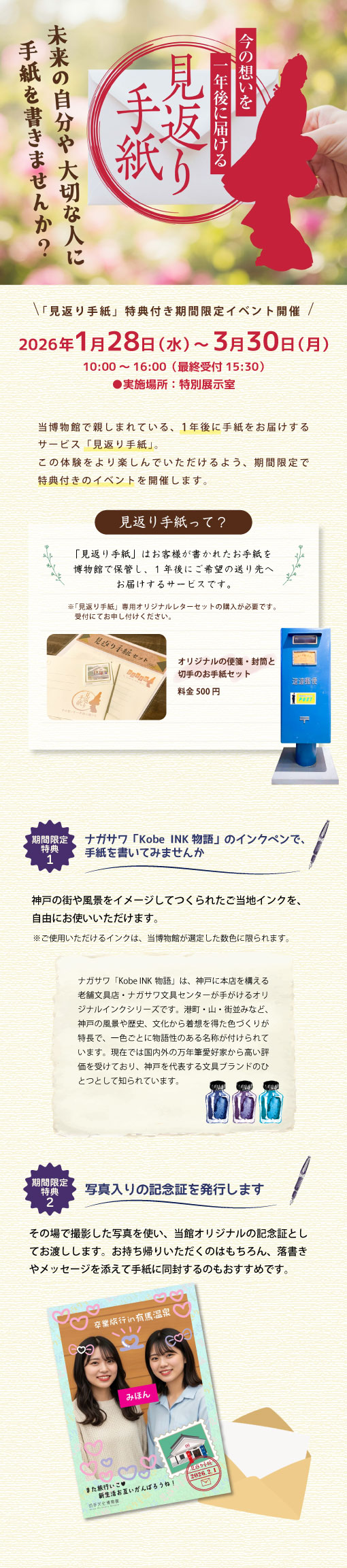博物館では、一年を通して参加できるワークショップや、夏休みやゴールデンウィークなどに子供向けのイベントなどを開催しています。 特別イベント →「切手で彩る絵はがき」教室のご案内はこちら →常設展示物のご案内はこちら