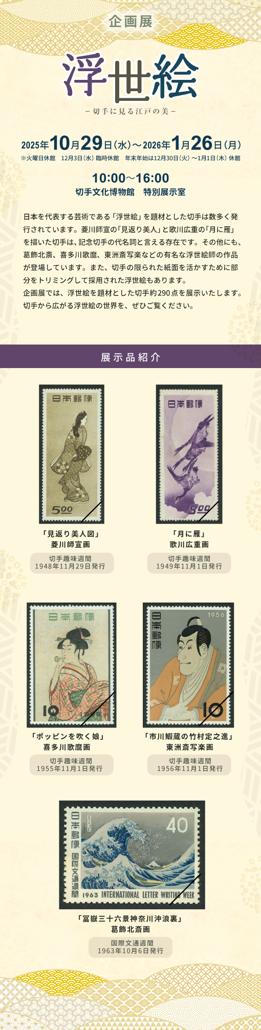 企画展「浮世絵-切手に見る江戸の美-」 関連イベントも開催します。